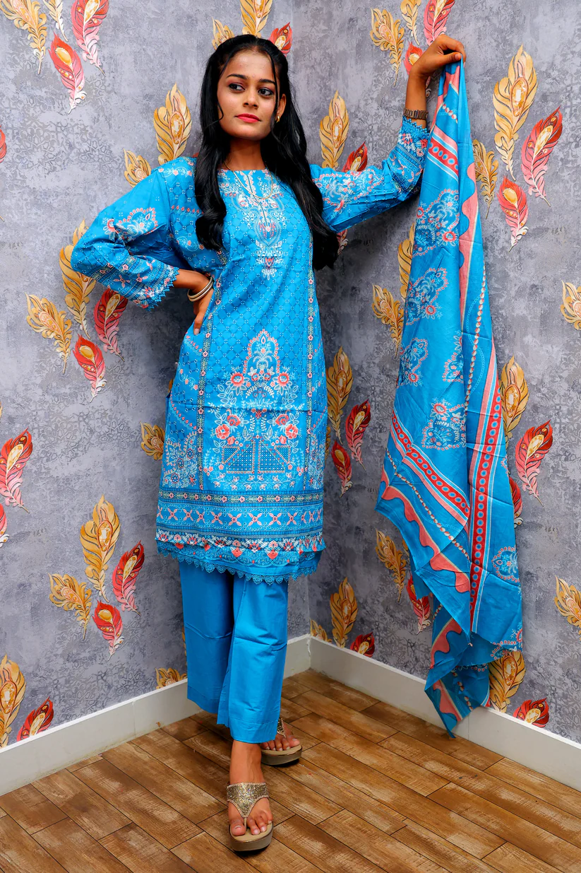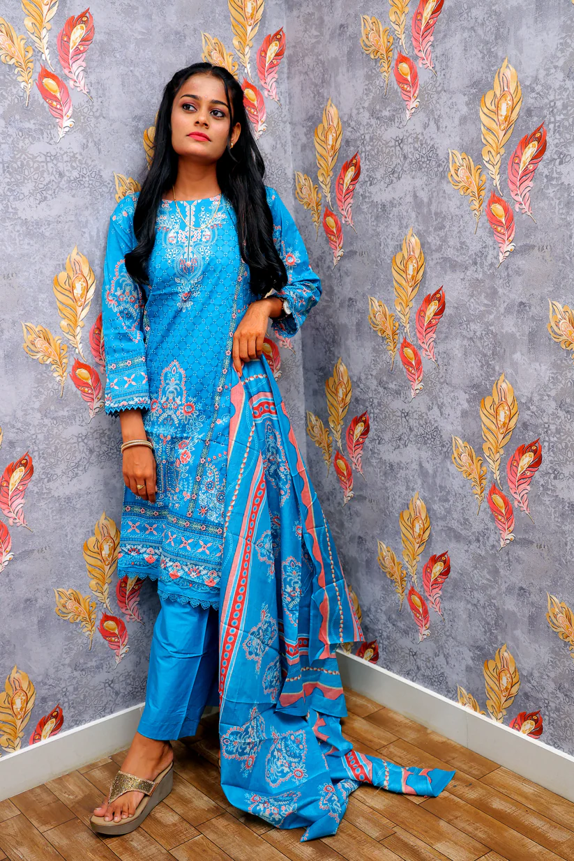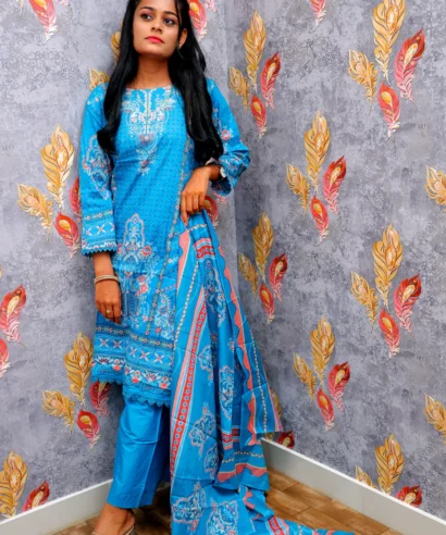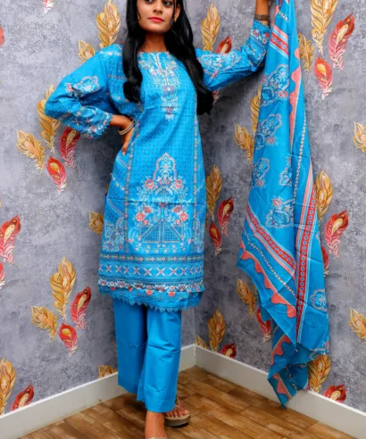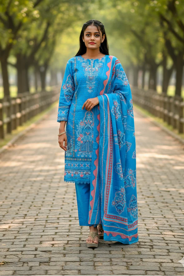 The soothing blue palette combined with delicate prints makes this ensemble ideal for daytime festivities, festive gatherings, cultural celebrations, and elegant everyday wear. Designed for effortless sophistication, this set offers both comfort and refined charm.