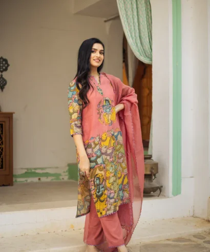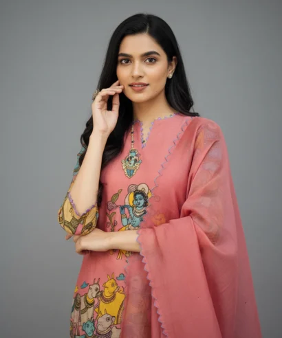 - Work: Coordinated Kalamkari Print, blending beautifully with the kurta and pants